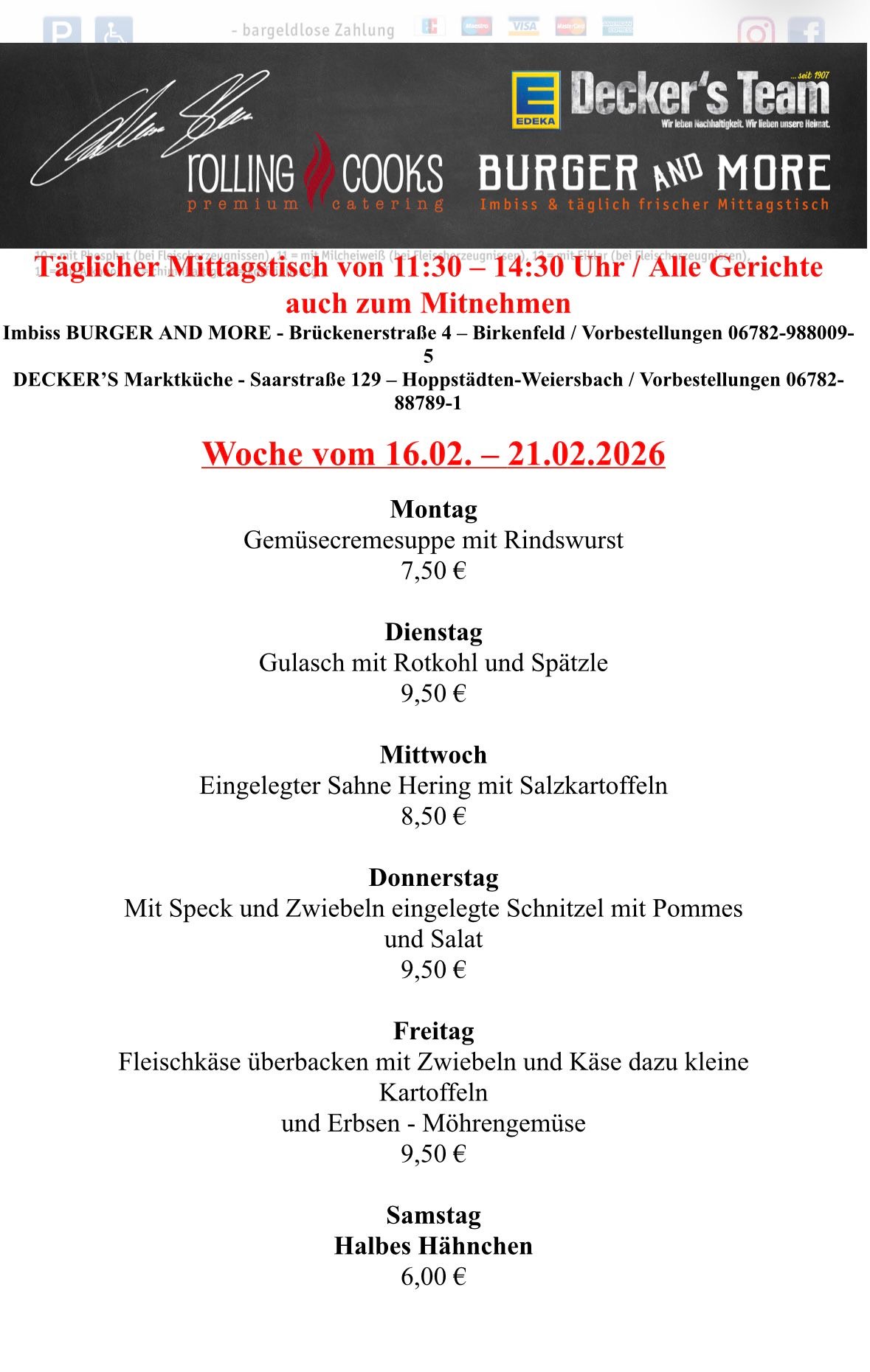 Mittagstisch vom 16.02.26-21.02.26 Montag Gemüsecremesuppe mit Rindswurst 7,50 € Dienstag Gulasch mit Rotkohl[…]
